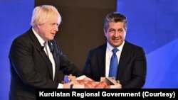 مەسرور بارزانی لەسەر سەکۆی کۆڕبەندەکە بە بۆریس جۆنسن دەڵێت، "سندوقێک لە هەناری کوردستان و هەنگوینی خۆمانت بە دیاری پێدەدەم. ئەمانە باشترین دیارین کە پێتی دەبەخشین بەخێربێیت."