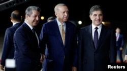 سەرۆکی تورکیا ڕەجەب تەیب ئەردۆغان گەیشتە فڕۆکەخانەی هەولێر و لەلایەن سەرۆکی هەرێمی کوردستان نێچیرڤان بارزانی و سەرۆک وەزیران مەسرور بارزانییەوە پێشوازی لێکرا.