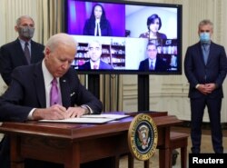 جۆو بایدن ئەمڕۆ پـێنجەشەممە و پاش ڕۆژێک لە گرتنەدەستی دەسەڵات بڕیارەکانی واژوکرد بە ئامادەبوونی کامڵا هێرس جێگری سەرۆکی ئەمەریکا و دکتۆر ئەنتۆنی فاوچی گەورە ڕاوێژکاری پـزیشکی سەرۆک.